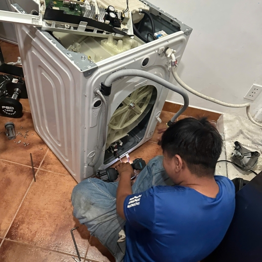 Hình ảnh minh họa quy trình: Thợ kỹ thuật đang tháo lồng giặt, làm sạch dàn nóng/lạnh, bo mạch và kiểm tra đường ống - đảm bảo máy chạy êm ái như mới!